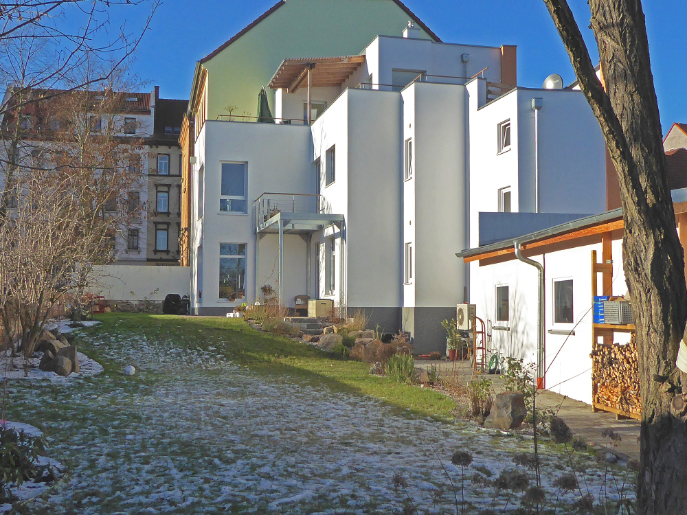 Irgendwann konnte auch die Familie überzeugt werden, dass diese guten Anbindungen den Nachteil der verkehrsbelasteten Straße auf der Nordseite mehr als ausgleichen. Diese Erkenntnis wurde besonders auch noch dadurch bestärkt, dass keine ähnlich gut an die Infrastruktur angeschlossenen Grundstücke mit unverbauter Südlage auf den Leipziger Grundstücksmarkt zu haben waren. Folglich wurden die Grundstücke gekauft (es waren insgesamt 3 von 2 unterschiedlichen Eigentümern) ein kompaktes Gebäude konzipiert welches auf der Westseite direkt an den bestehenden Altbau einschließen sollte und über ein auf der Ostseite angehängtes Treppenhaus erschlossen werden sollte. Treppenhaus und bestehender Altbau sollten das Gebäude von der Ost-und Westseite gegen Witterungseinflüsse schützen und helfen energiebilanztechnisch den Passivhausstandard zu erreichen und möglicherweise sogar übertreffen. Die nach Norden zum Verkehr und zur energietechnisch ungünstigsten Seite gerichtete Nordwand sollte schall-und wärmeschutztechnisch und somit letztlich auch architektonisch eine besondere Bedeutung und gestalterische Ausprägung erhalten.
